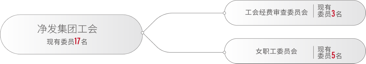 凈發(fā)集團(tuán)工會(huì)現(xiàn)有委員17名,其中主席1名,副主席1名。凈發(fā)集團(tuán)工會(huì)經(jīng)費(fèi)審查委員會(huì)現(xiàn)有委員3名,其中主任1名。凈發(fā)集團(tuán)女職工委員會(huì)現(xiàn)有委員5名,其中主任1名。