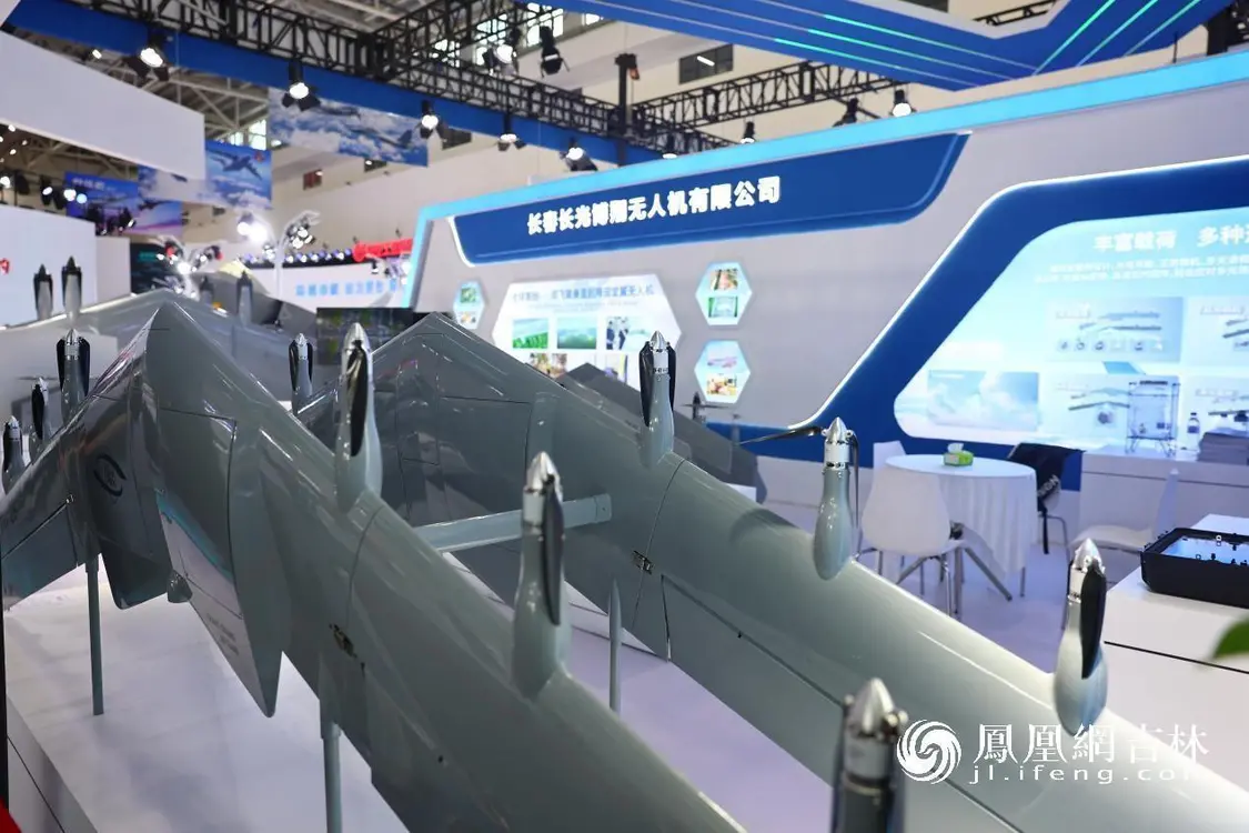 與長光衛(wèi)星師出同門的長光博翔,曾推出全球首創(chuàng)“雙飛翼垂直起降固定翼無人機”被關(guān)注。在此基礎(chǔ)上,該公司已研發(fā)出六個系列的產(chǎn)品。此次長春航展帶來了機巢BX100、鋒鏑100多用途無人機兩款首發(fā)新品。現(xiàn)場展出翼展2.5米、機身長度1.78米的鋒鏑100雖然輕巧,但其起飛重量可達100公斤,巡航速度最快可達每小時180公里,飛行距離大于1000公里。
